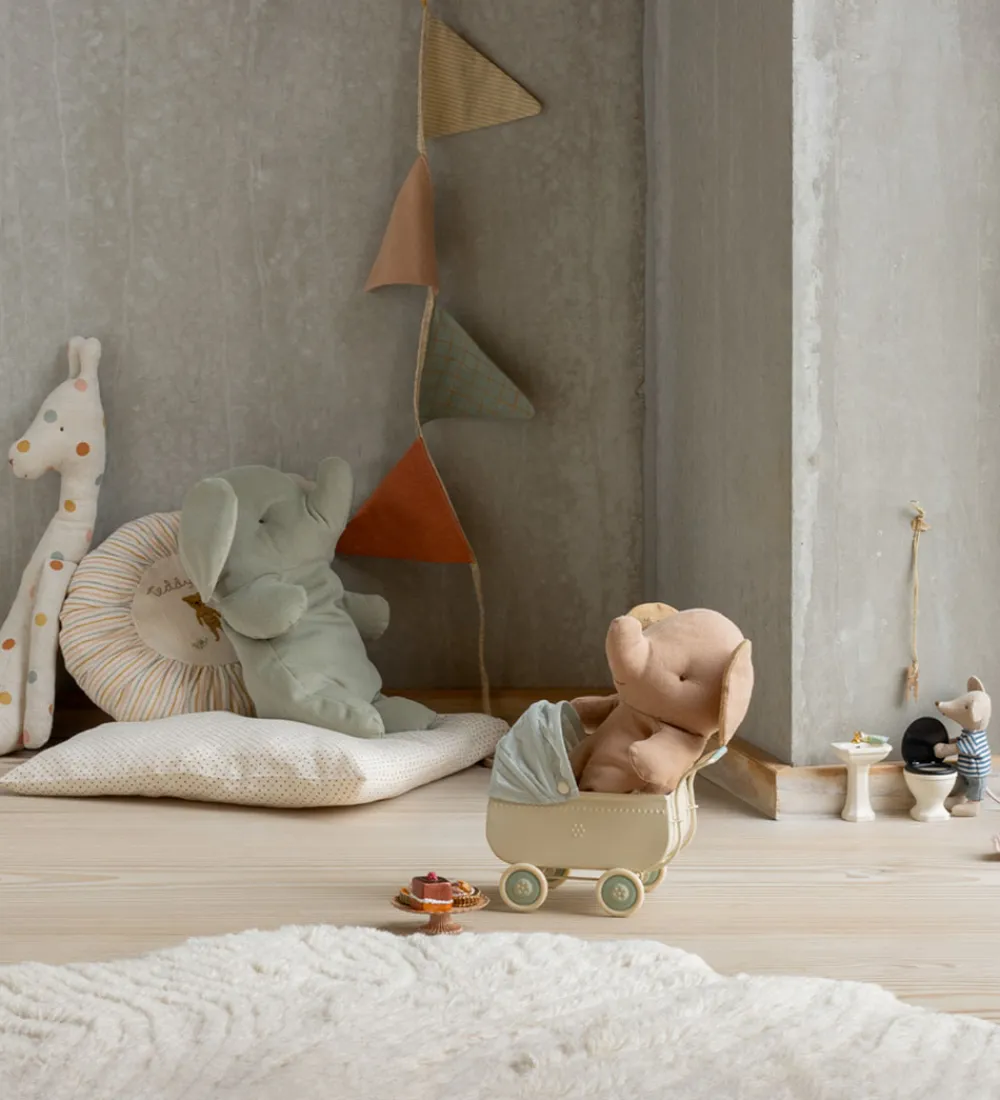 Nuttet Maileg bamse formet som en elefant i grå og med prikkede ører.