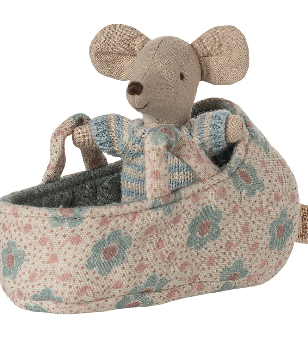 Skøn Maileg babymus med en stribet, lyseblå body. Babymusen kommer med en blomstret babylift i beige nuance med blå blomster, perfekt til kreativ leg. Maileg sikrer charmerende design og høj kvalitet.