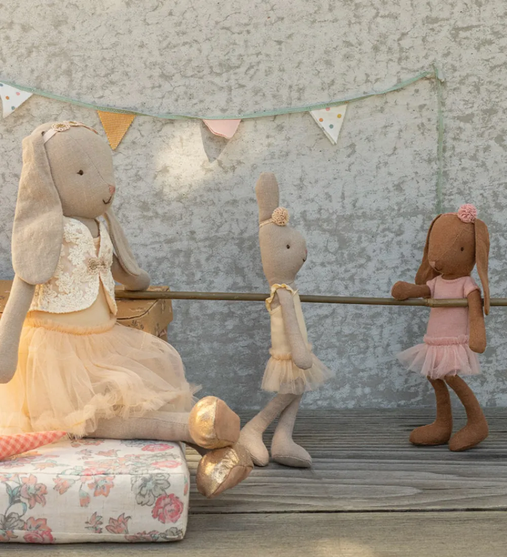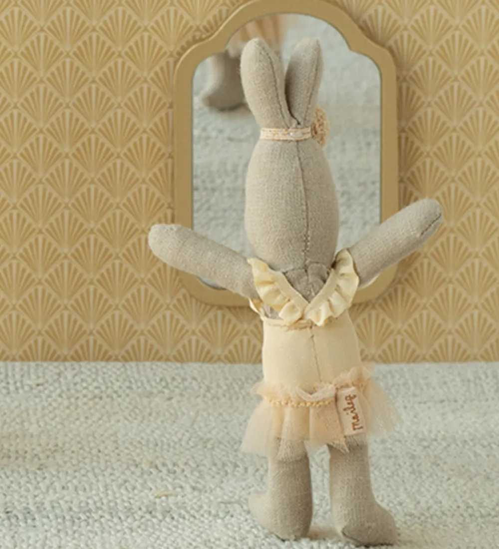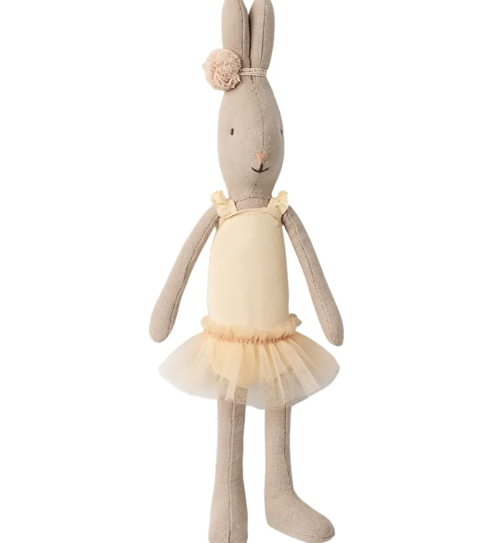 Fin Maileg hare i beige iført en gul balletdragt og et tylskørt.