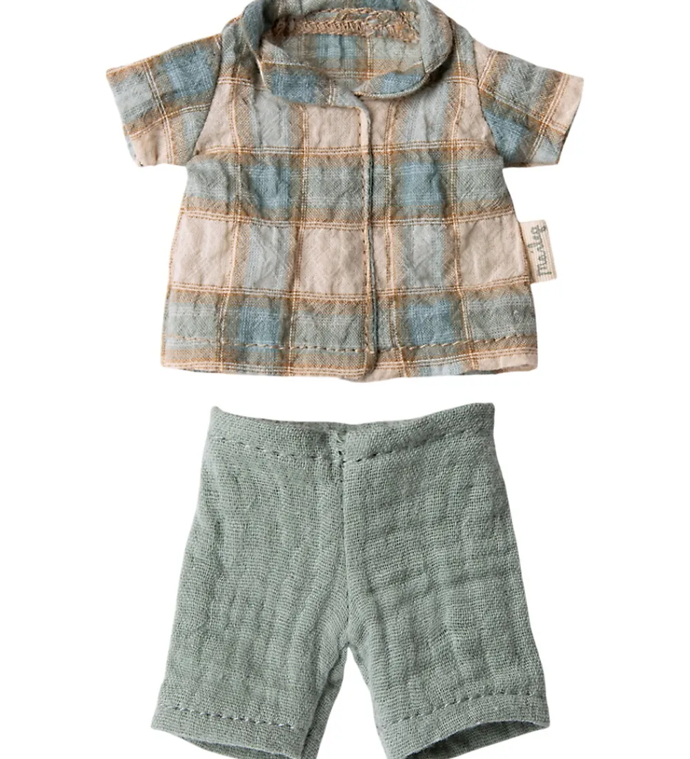 Charmerende Maileg hare klædt i en skøn skjorte i blå og beige med tern samt blå shorts.