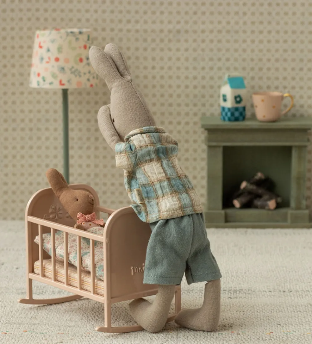 Maileg hareen er blød og kan leges med som en dukke, og tøjet kan tages af og på. I kroppen er den fyldt med PP-piller, som giver den mere tyngde.