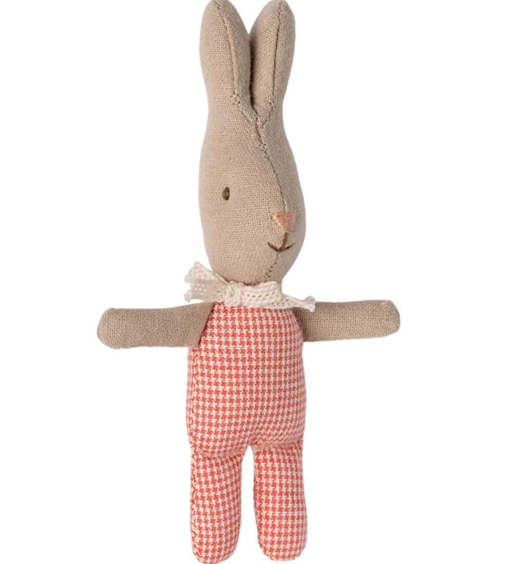 Sød Maileg bamse formet som en beige kanin med ternet tøj i rød og hvid, samt en rosa sløjfe bundet om halsen.