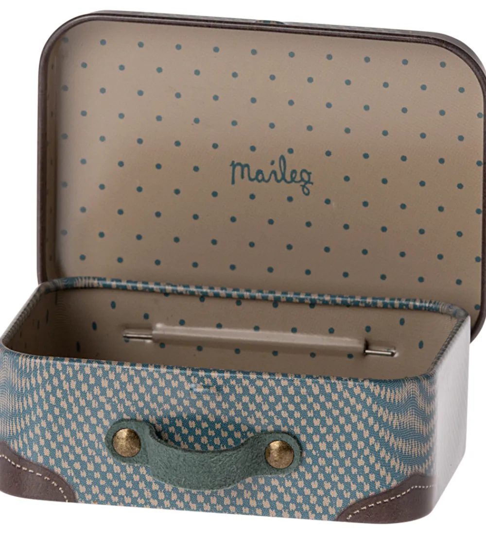 Fin Maileg kuffert i blå med beige prikker og brune hjørner, samt et print af vintage klistermærker. Kuffertens håndtag er fremstillet af imiteret ruskind i blå.