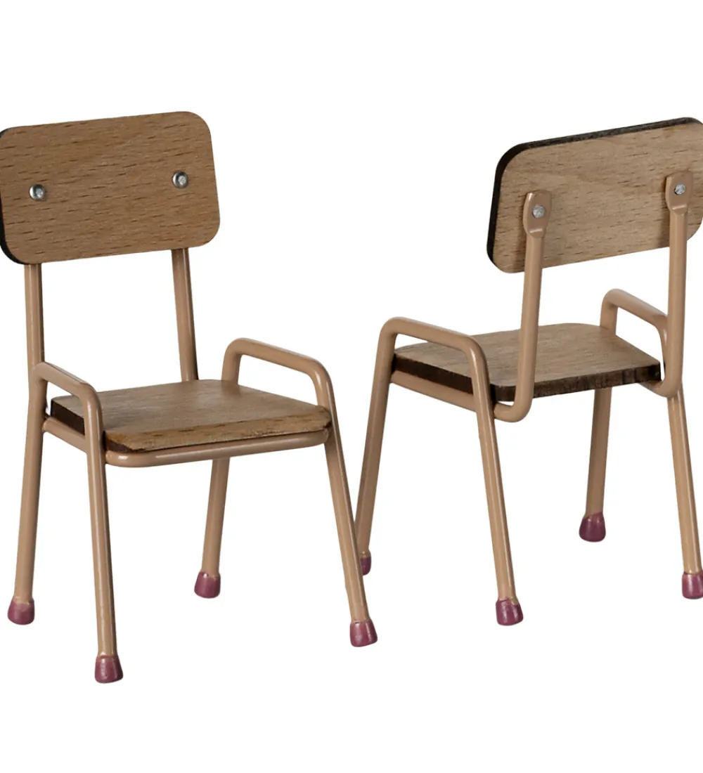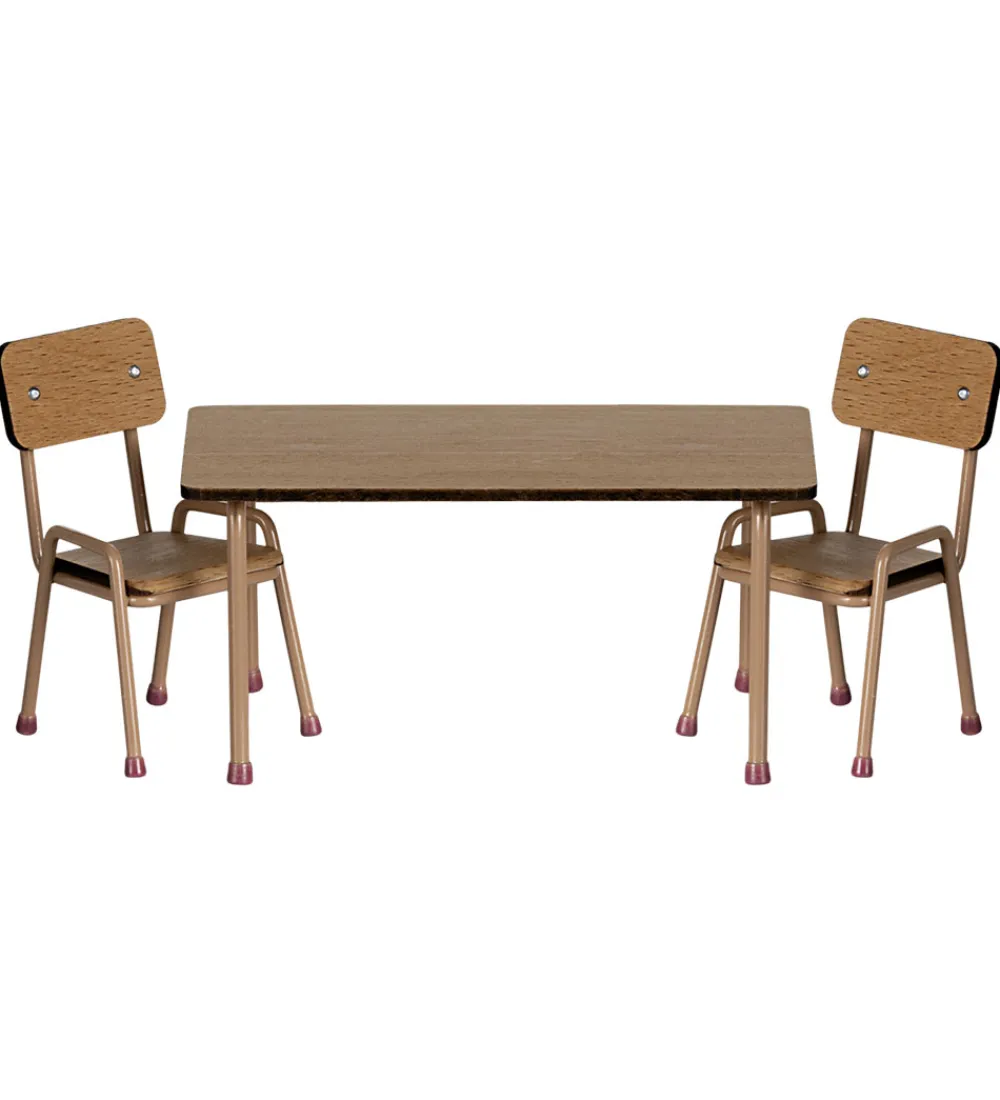 Fint Maileg dukkemøbel-sæt med et bord og to stole i et mørkt, pudderrosa farvetema. Dukkemøbel-sættet er i træ og metal.