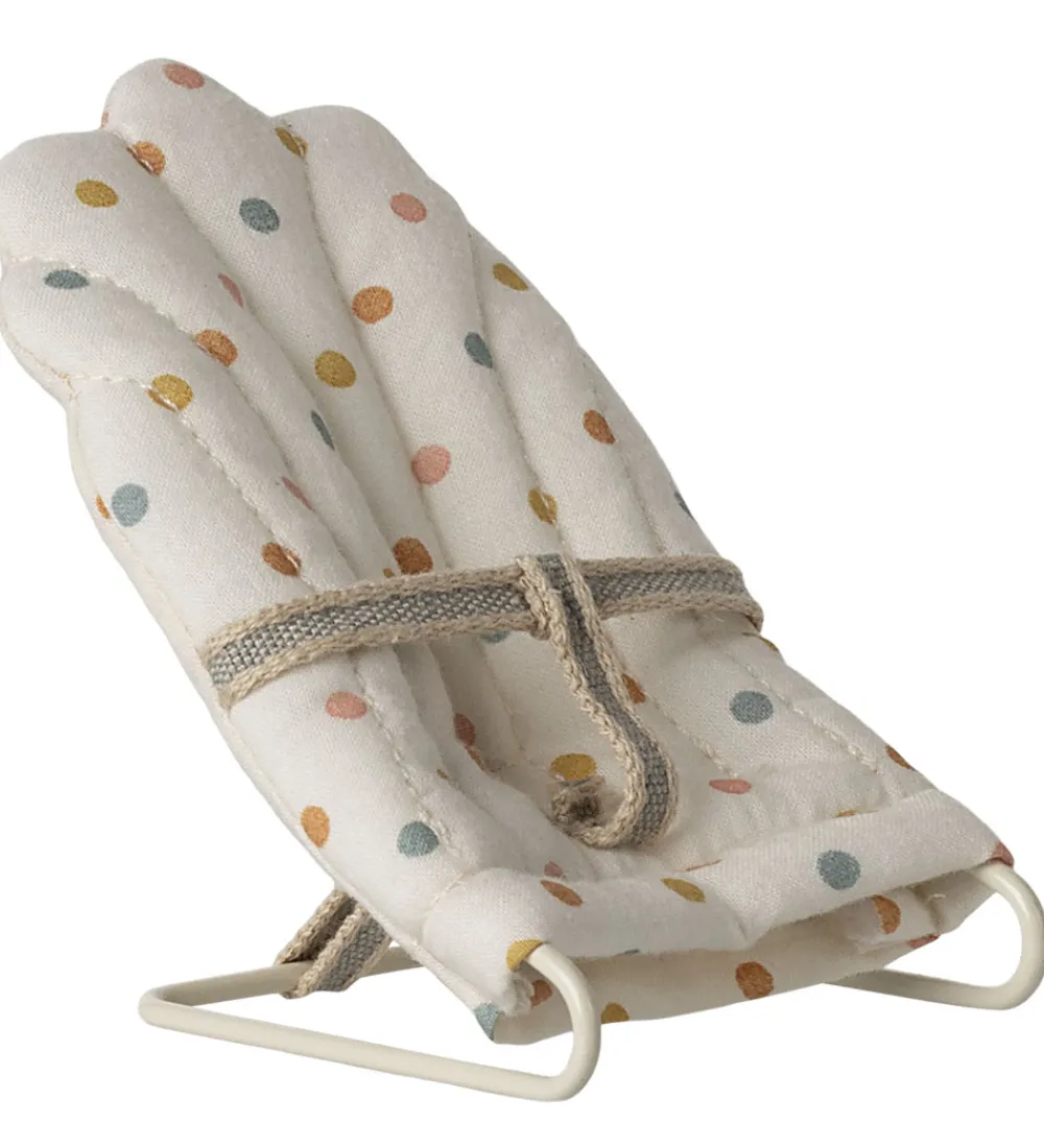 Charmerende Maileg dukketilbehør bestående af en skråstol i hvid med et farverigt, prikket mønster. Maileg dukketilbehøret kombinerer stil med funktionalitet og giver en dejlig æstetisk tilføjelse til dukkelegen.