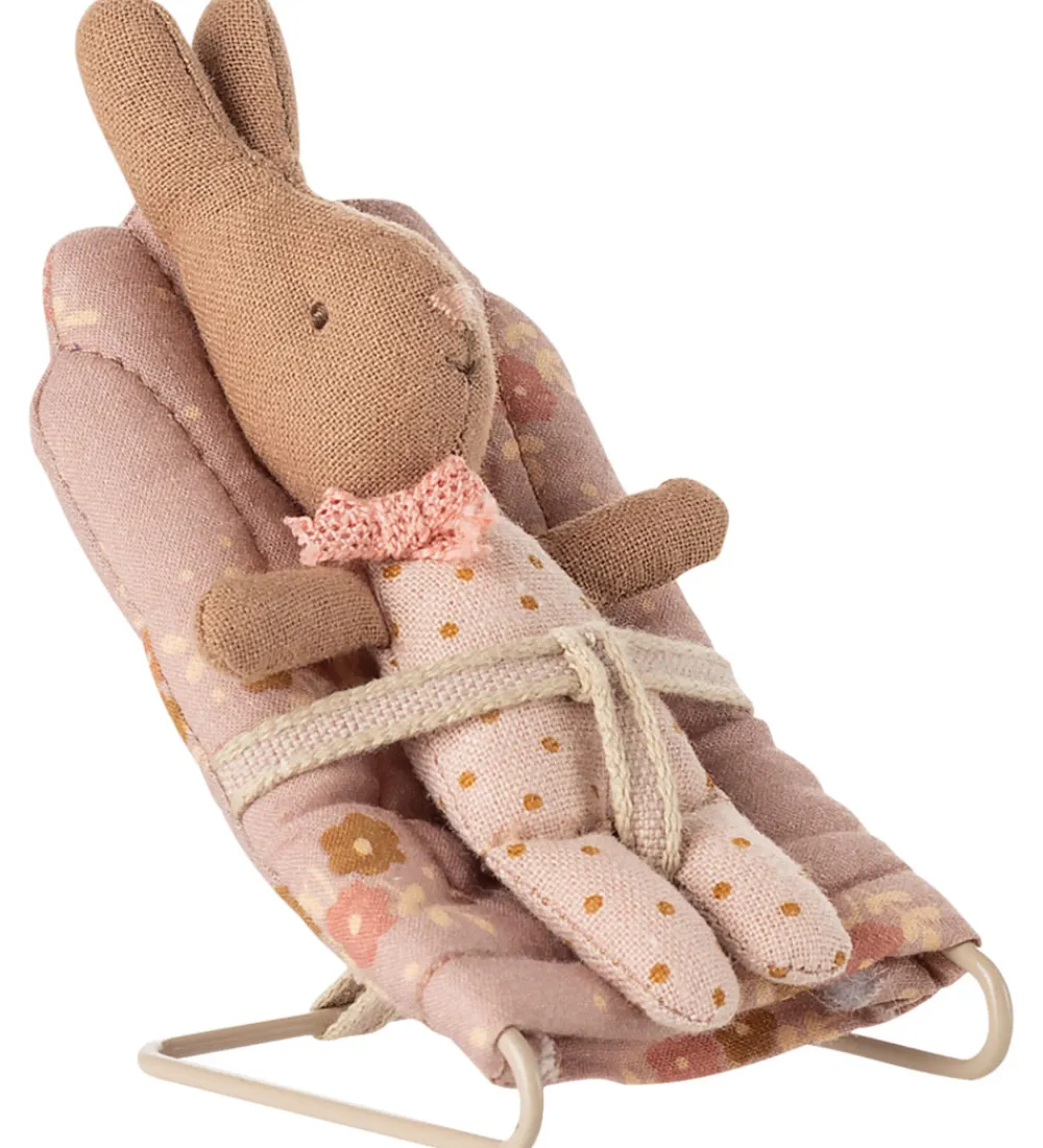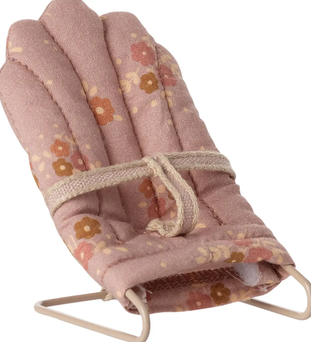 Fin Maileg skråstol i en varm rosa farve med et delikat blomsterprint og med en rosa sele. Skråstolen er i et vintage-design og lavet af metal og tekstil.