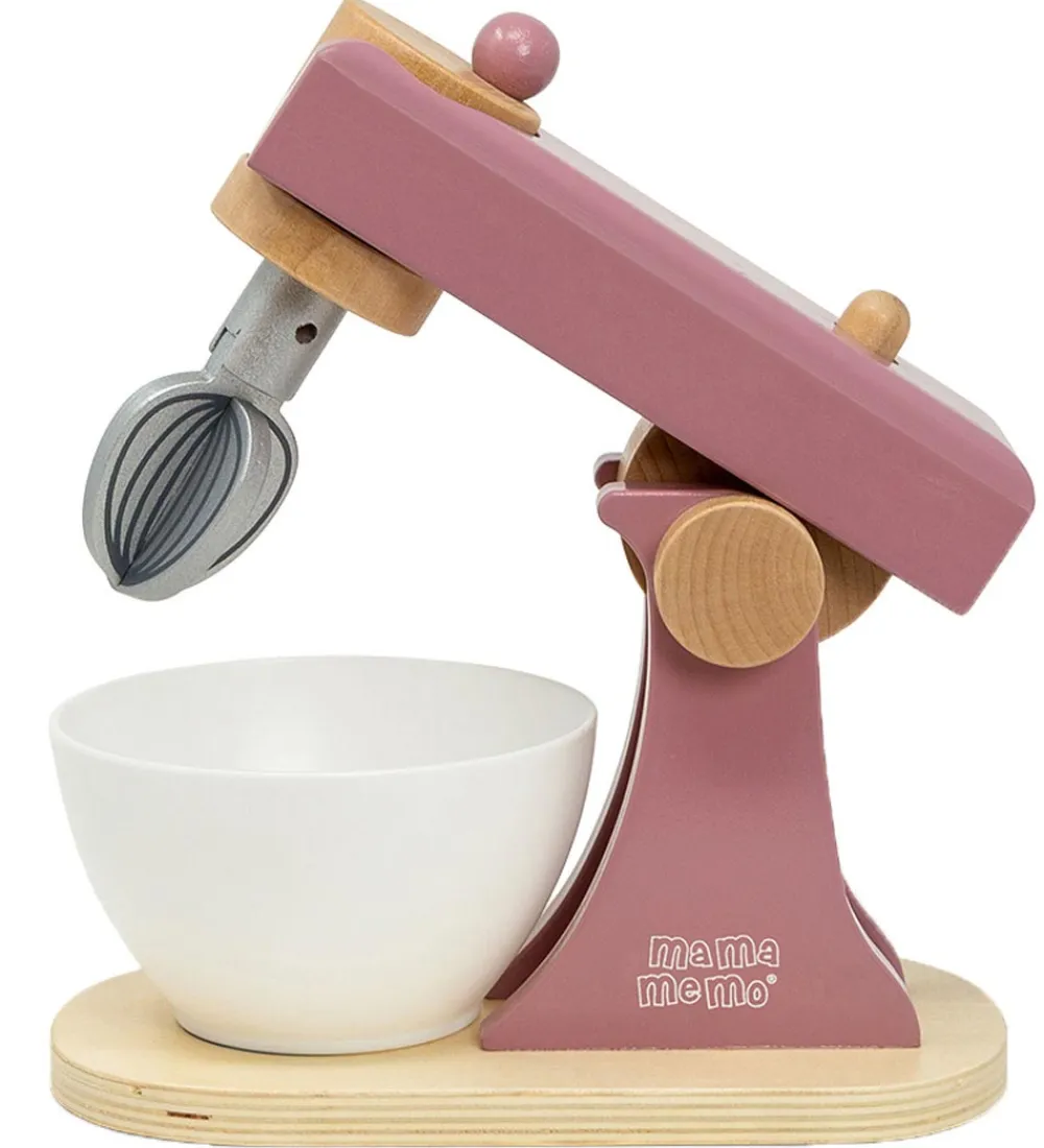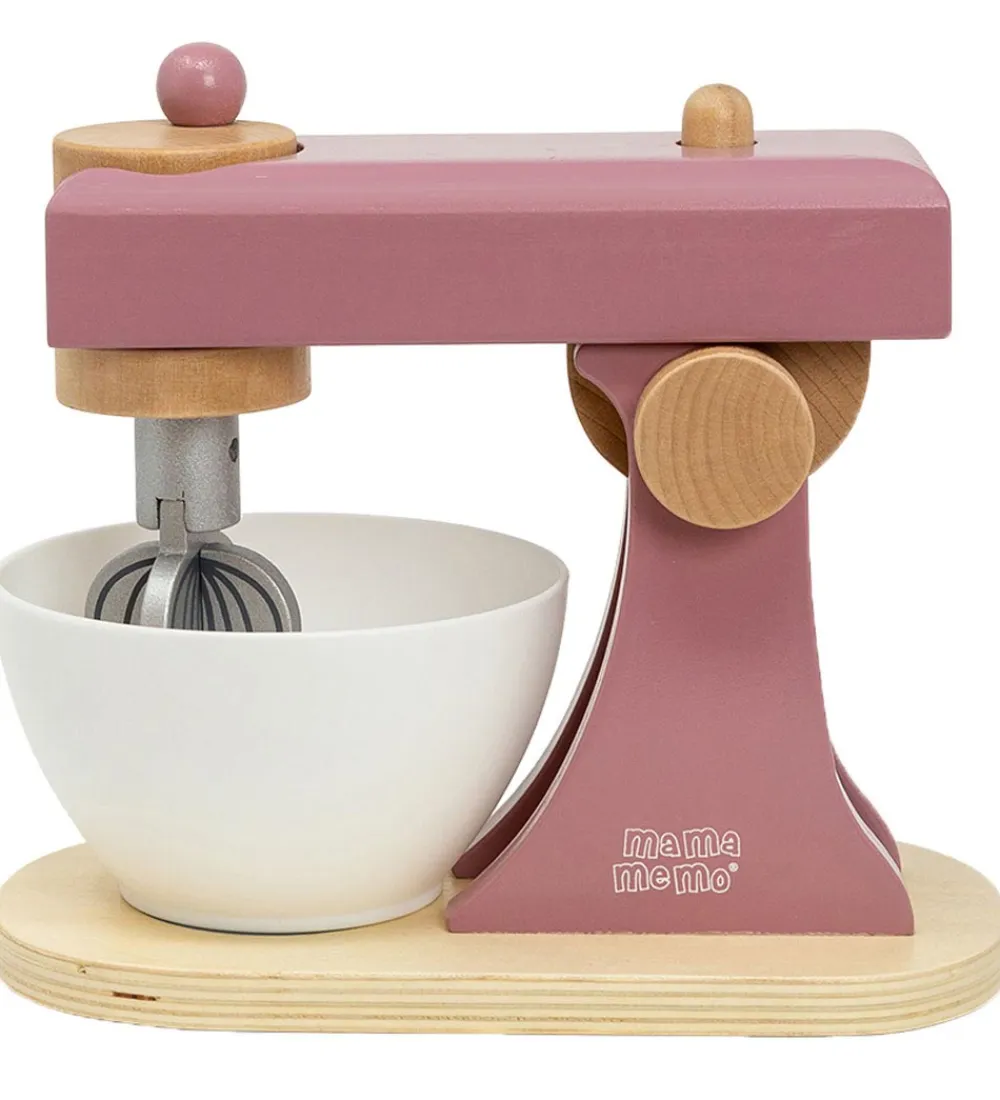 Smart MaMaMeMo røremaskine i rosa, med en hvid skål og tre forskellige redskaber i sølv.