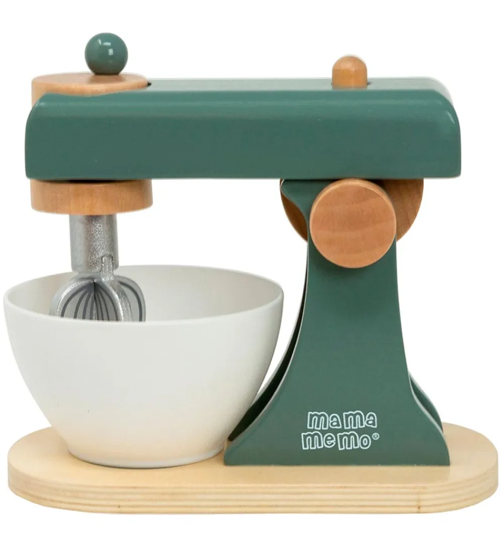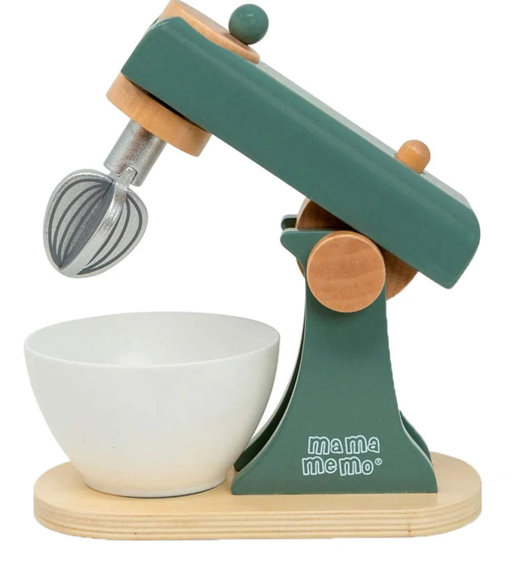 Smart MaMaMeMo røremaskine i grøn, med en hvid skål og tre forskellige redskaber i sølv.