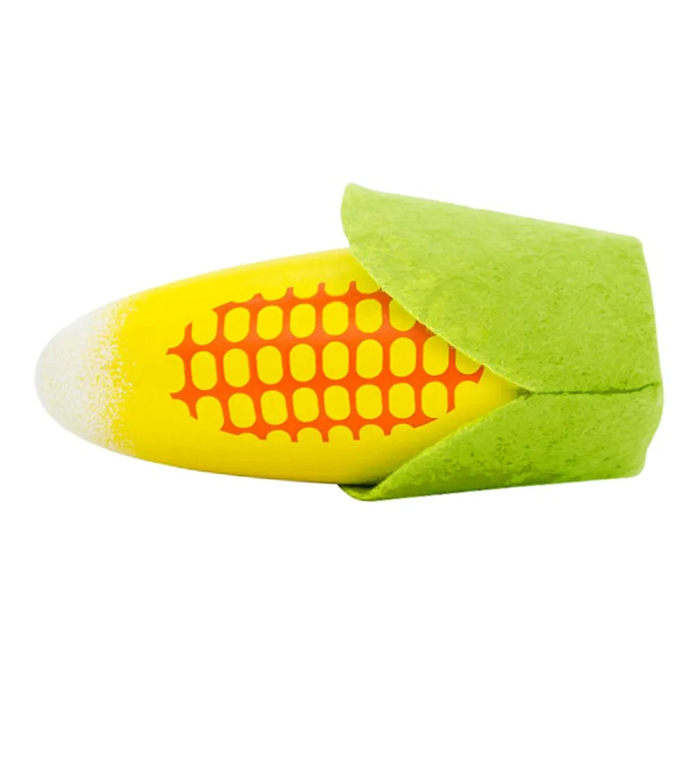 Underholdende MaMaMeMo legemad bestående af en majskolbe, med et grønt stykke fleece i toppen.