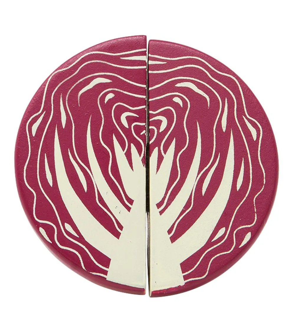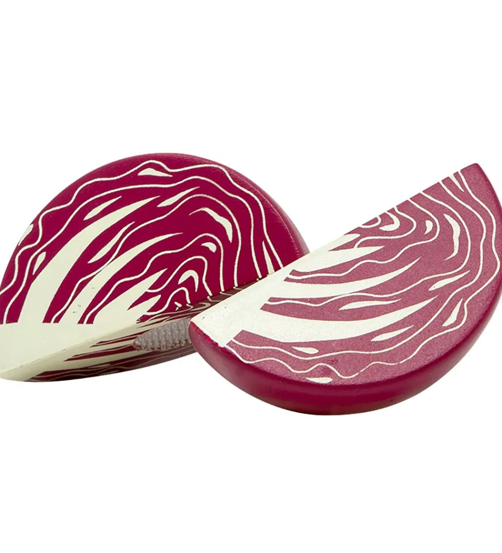 MaMaMeMo legemaden er i træ, hvor rødkålen er i to dele med velcro, så de kan sættes sammen og tages fra hinanden.