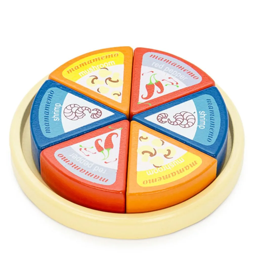 MaMaMeMo legemaden er i træ og er 7 dele, med to oste med rød peber, to med rejer og to med champignoner.