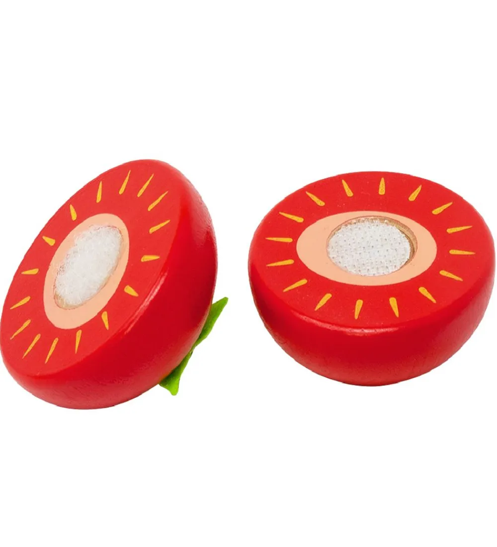 MaMaMeMo legemaden er i træ og består af to stykker, som sidder sammen med velcro så barnet kan tage dem fra hinanden og sætte dem sammen igen.