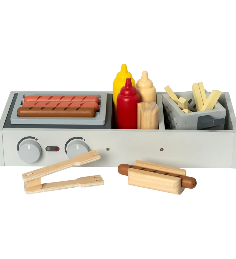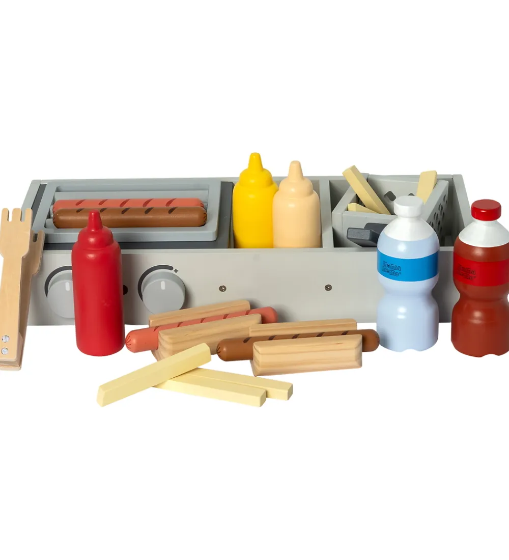 Farverigt MaMaMeMo legemad der forestiller en pølsebod med friture og en pølsesteger, og inkluderer 4 pølser, to pølsebrød, pommes frites samt forskellige tilbehørsdele. Legen bliver endnu sjovere med MaMaMeMo legemad.