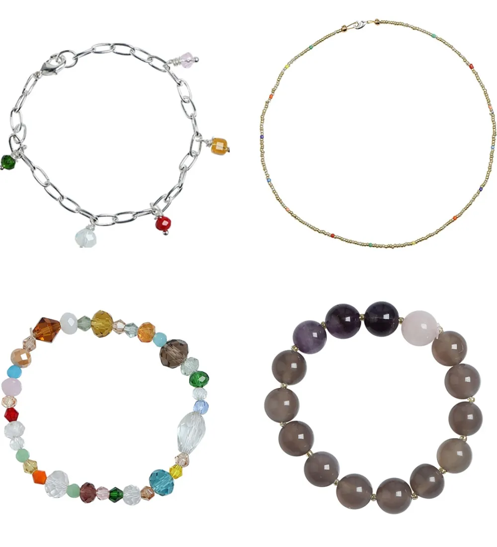 - Perler: Blandede glasperler, halvædelsten, shell perle