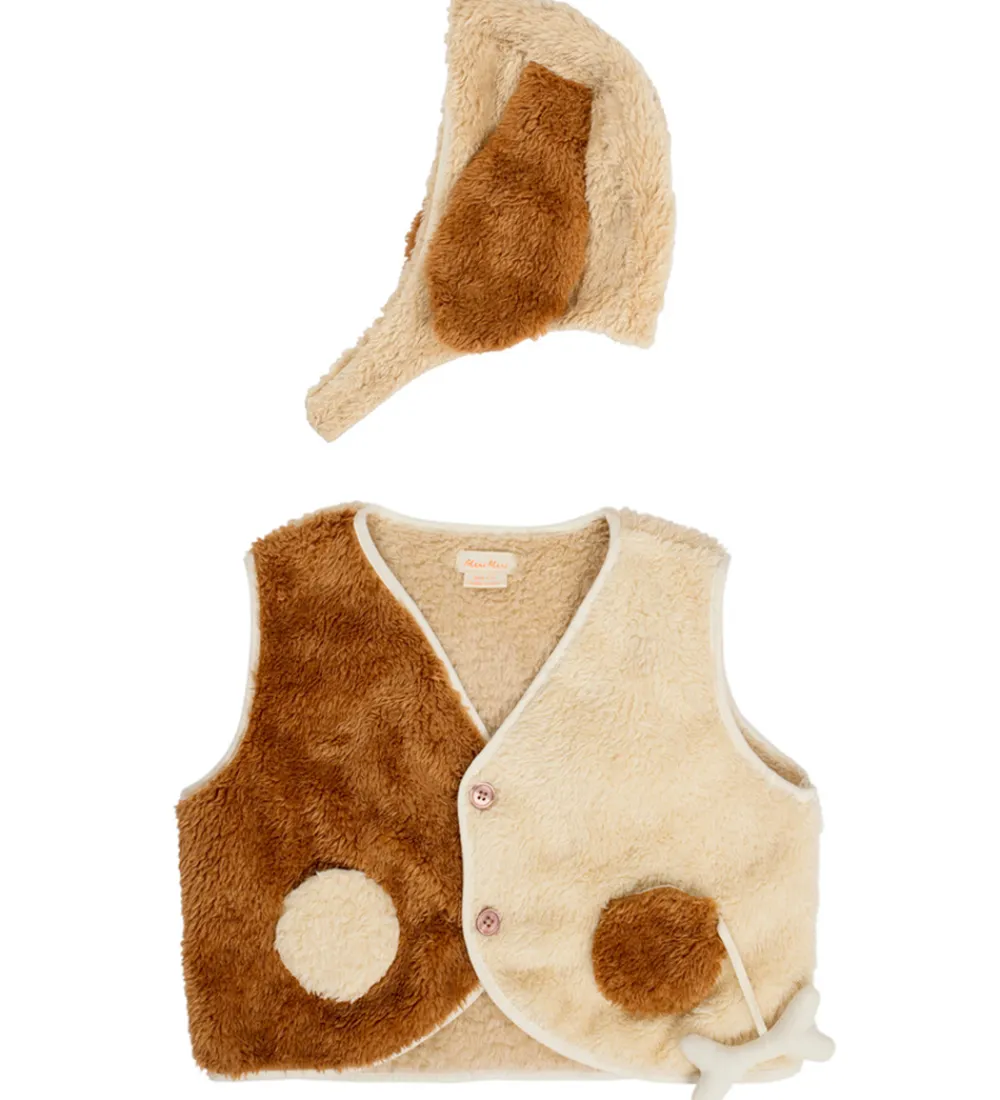 Meri Meri udklædningen er af teddyfleece og består af en vest med knaplukning, lommer og et “kødben”-vedhæng og en hat med lange hundeører og velcrolukning under hagen.