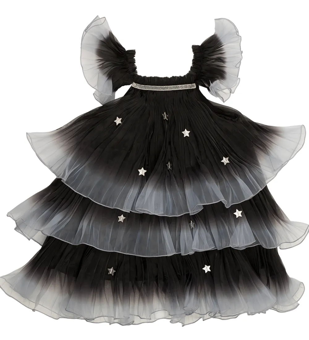 Sej Meri Meri udklædning, der består af en kjole, en hat og en trylelstyav, så man kan ligne en flot heks. Kjolen er sort og består af flere forskudte lag i en delvis gnnemsigtig kvalitet og med flotte plisseringer og grå kanter. På det yderste lag sidder der små sølvfarvede stjerner. Hatten er sort med sølvfarvede stjener og en grå kant, og tryllestaven er sort med en sølvfarvet stjerne i toppen.