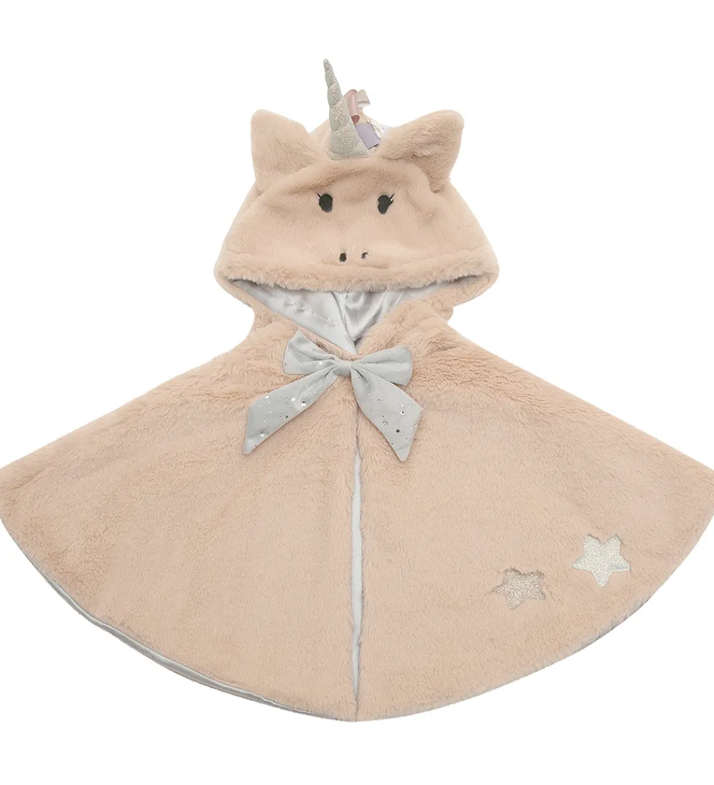 Sød Mimi & Lula kappe, der er en enhjørninge-udklædning, i rosa plys med flotte glimmerdetaljer.
