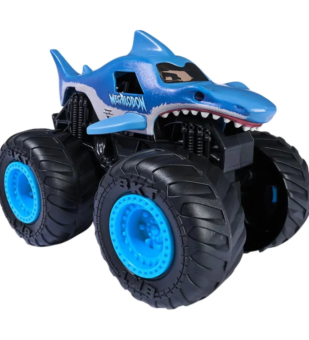 Spændende Monster Jam bil i en markant, blå farve med et imponerende Megalodon-print. Monster Jam bilen har robuste sorte dæk med blå detaljer, der giver et sejt look til leg og samling. Derudover har bilen seje lyd- og lyseffekter.