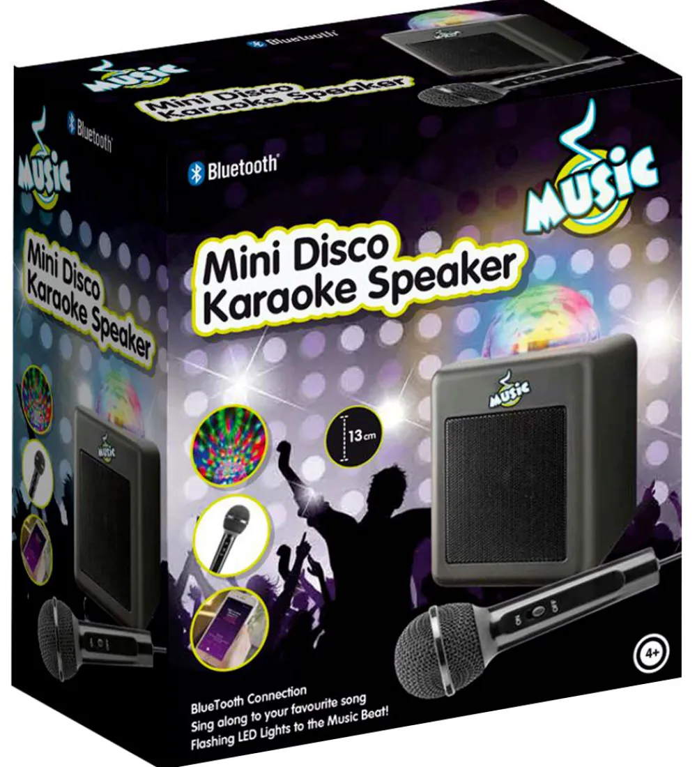 Sjovt Music karaokesæt bestående af 1 mikrofon og en højtaler med en diskokugle på toppen.