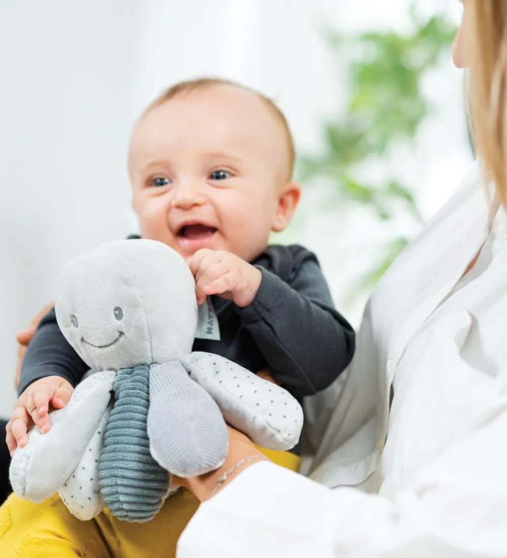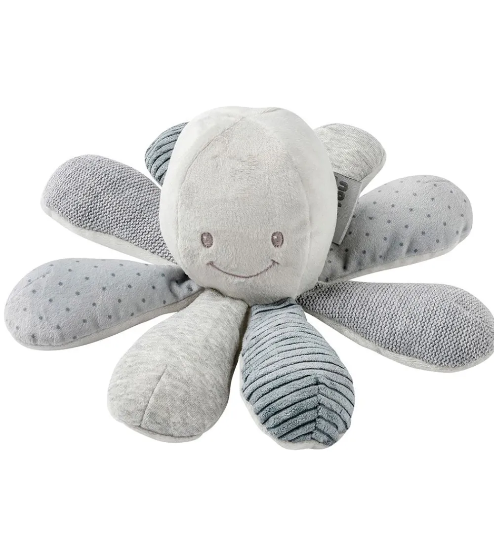 Sjovt Nattou aktivitetslegetøj i grå plys, med form som en blæksprutte med et broderet ansigt. Tentaklerne har forskellige strukturer i overfladen og er i forskellige nuancer af grå.
