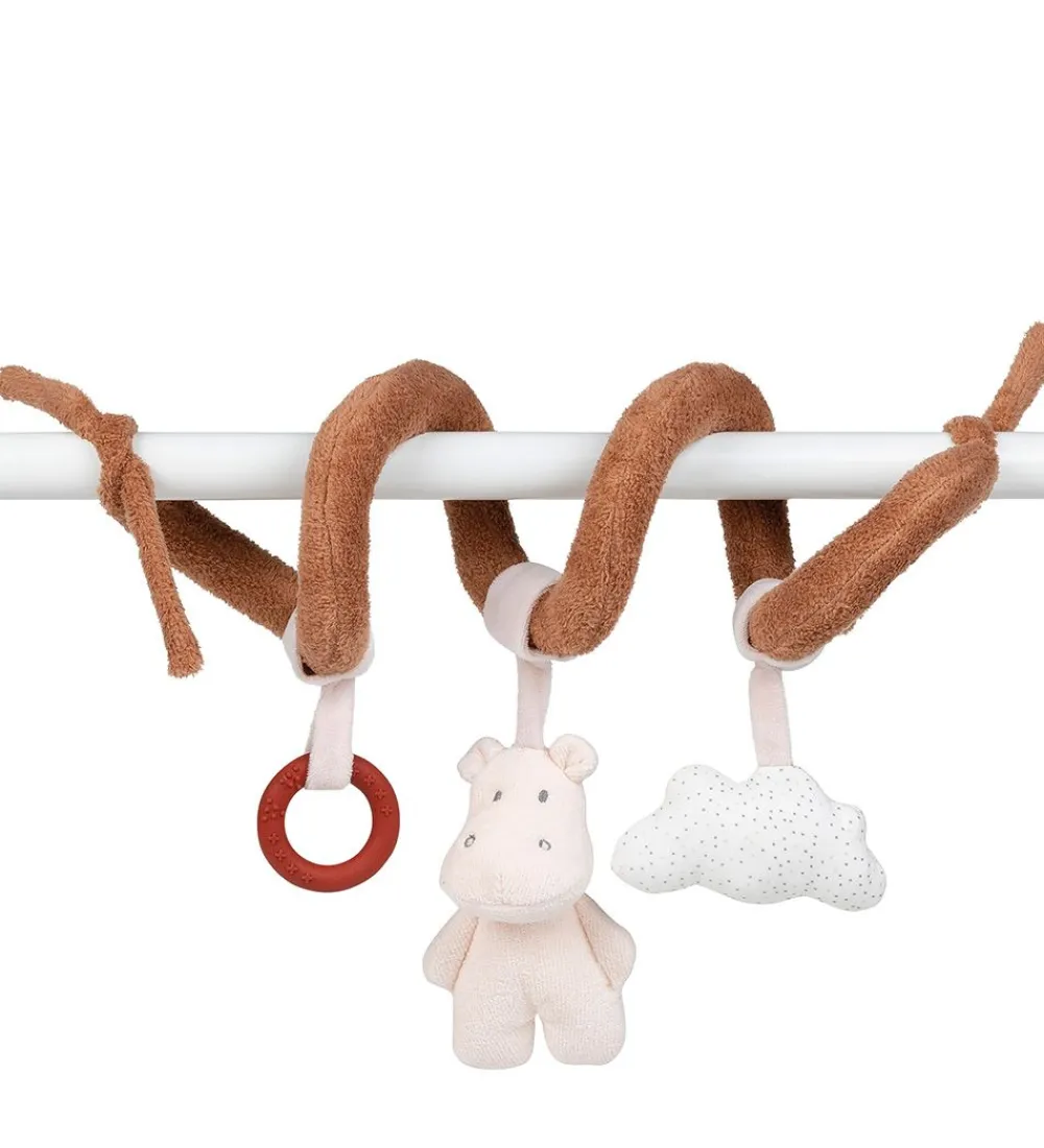 Godt Nattou aktivitetslegetøj i brun plys, med tre vedhæng under bunden af en rosa flodhest, en rød bidering og en hvid sky.