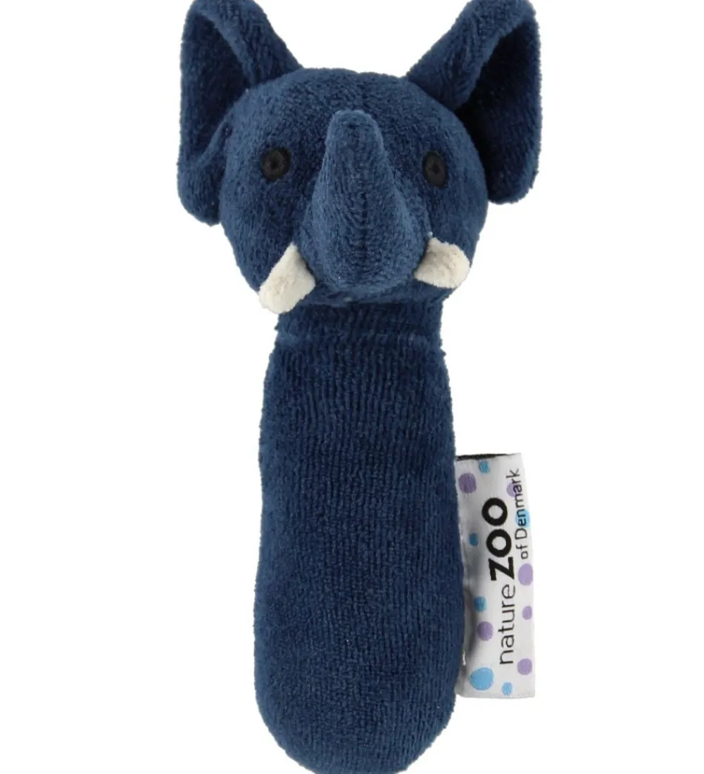 Skøn NatureZoo rangle med form som en mørkeblå elefant med store bløde ører og små hvide stødtænder.