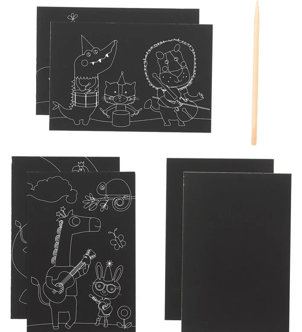 Ooly sættet består af seks kort hvor det sorte kan skrabes af med en medfølgende træpen. Fire af kortene har et motiv på, hvor de to sidste kort er blanke, hvor børnene selv kan finde på et motiv med regnbuefarvet baggrund. Kortene kan skrabes med mønstre eller som barnet nu vil have det.