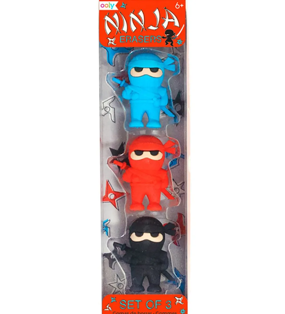 Sejt Ooly sæt bestående af tre viskelædere, som forestiller ninjaer samt 12 blyanter med tegneseriebobler og en blå blyantspidser.