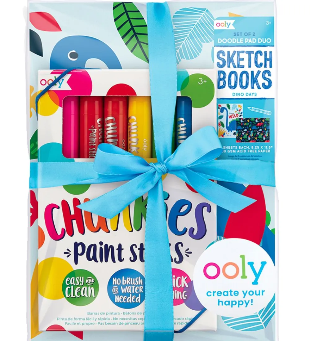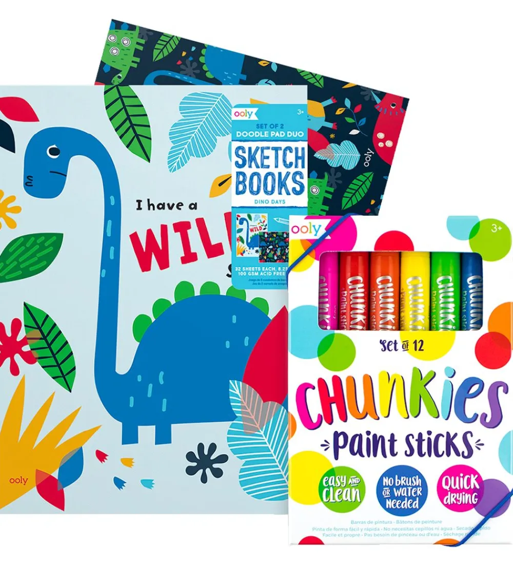 Ooly tuscherne er ekstra tykke og har en flot effekt som minder om vandfarve. Begge malebøger har motiver inspireret af dinosaurer og sættet er perfekt til den lille kunstner.