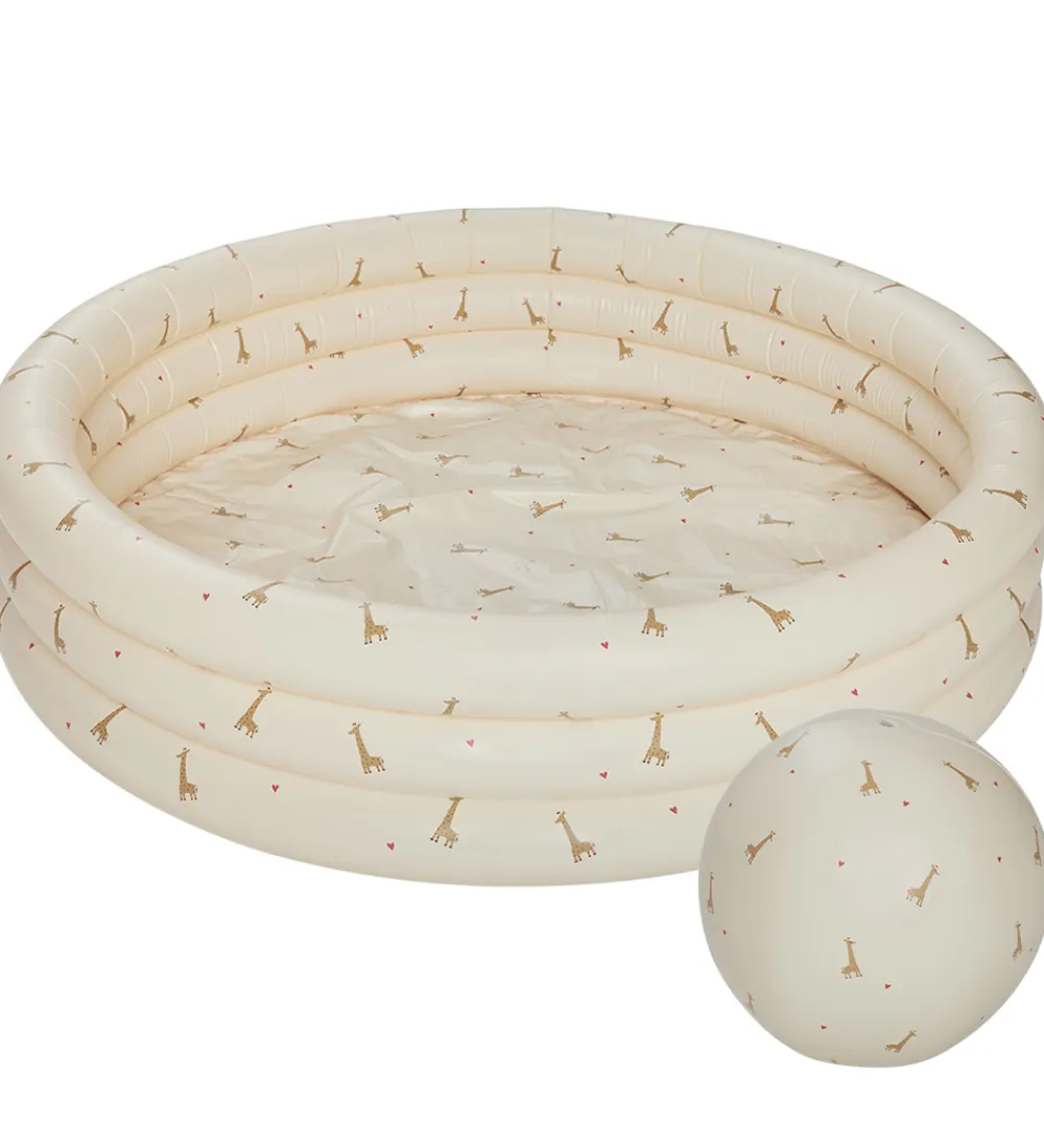 Fint OYOY badebassin og badebold lys gul med et alloverprint af giraffer i brune nuancer og små røde hjerter.