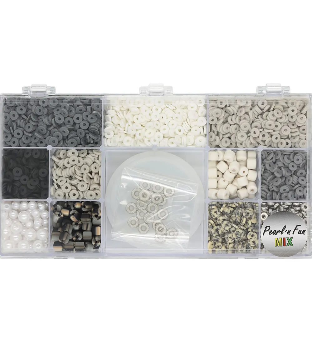 Fine Pearl N Fun perler i et sort, hvidt og gråt farvetema og med forskellige former i et sæt til at lave flotte smykker.