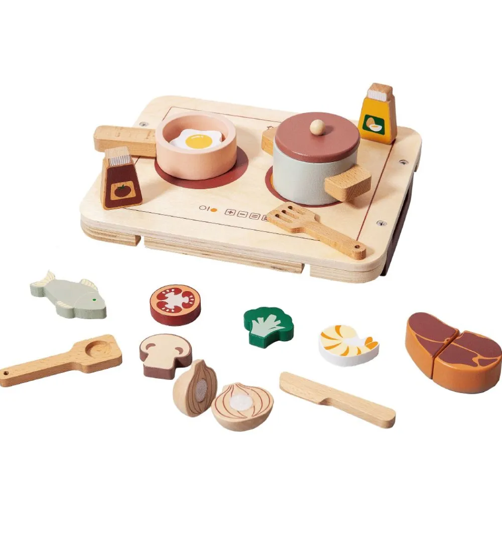 Sættet indeholder en serveringsbakke, og når den bliver vendt om, er der 2 kogeplader, så den kan bruges som et komfur. Der medfølger også en gryde og en pande, forskelligt legemad og nogle køkkenredskaber.