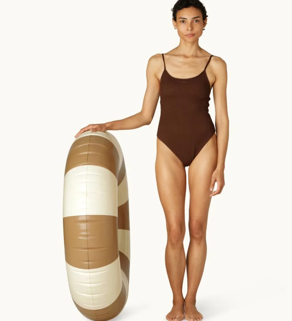 Lækker Petites Pommes badering i et stribet design med cremehvide og karamelbrune farver.