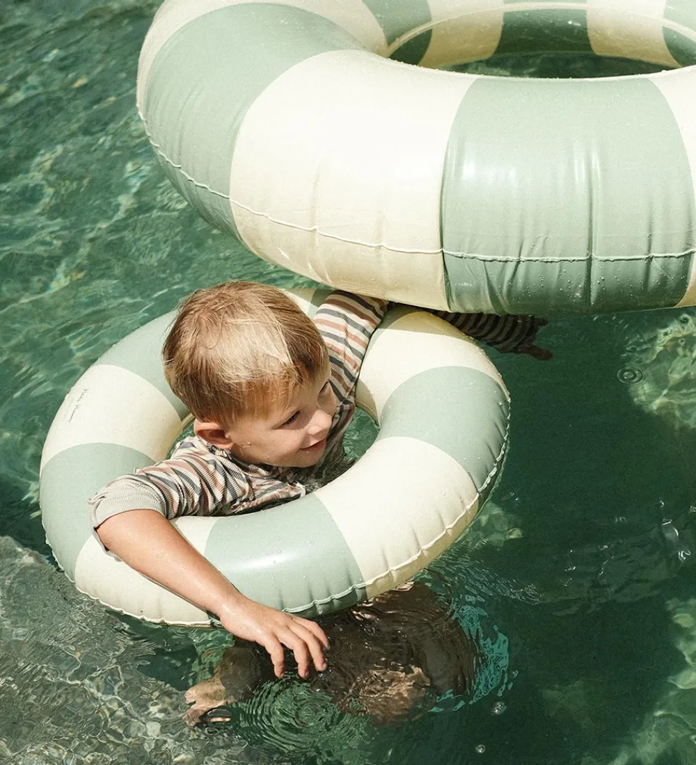 Skøn Petites Pommes badering i et stribet design med cremehvide og støvet grønne farver.