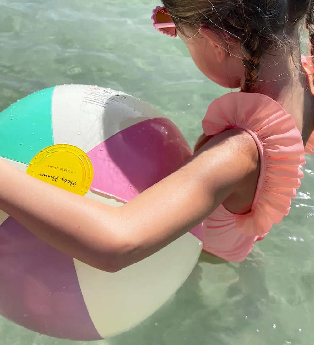 Flot Petites Pommes badebold med striber i cremehvid, mintgrøn, lilla og rosa samt med en gul cirkel i hver ende.