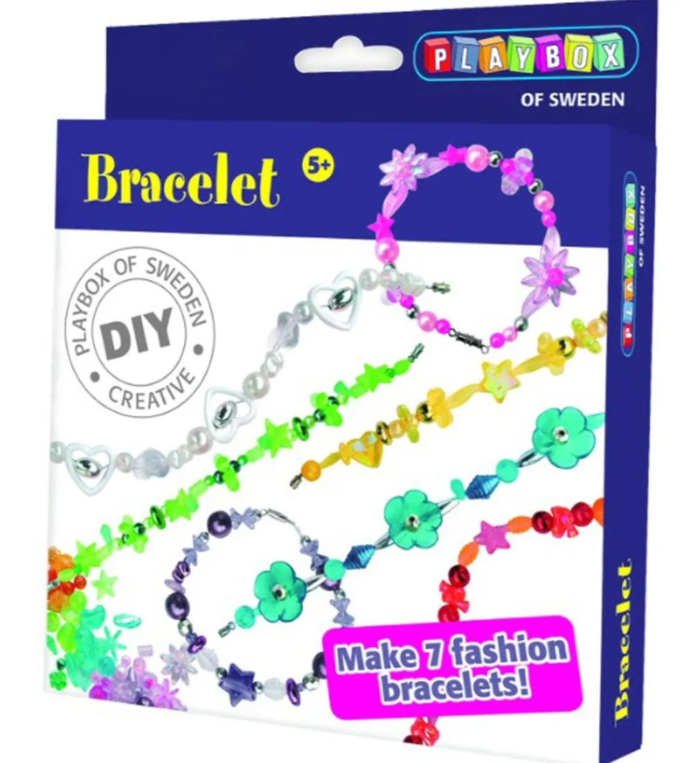 Playbox perlerne har forskellige former og farver. Her har barnet mulighed for at lave nogle flotte og festlige armbånd. Der medfølger en lille vejledning til hvordan man laver armbåndene.