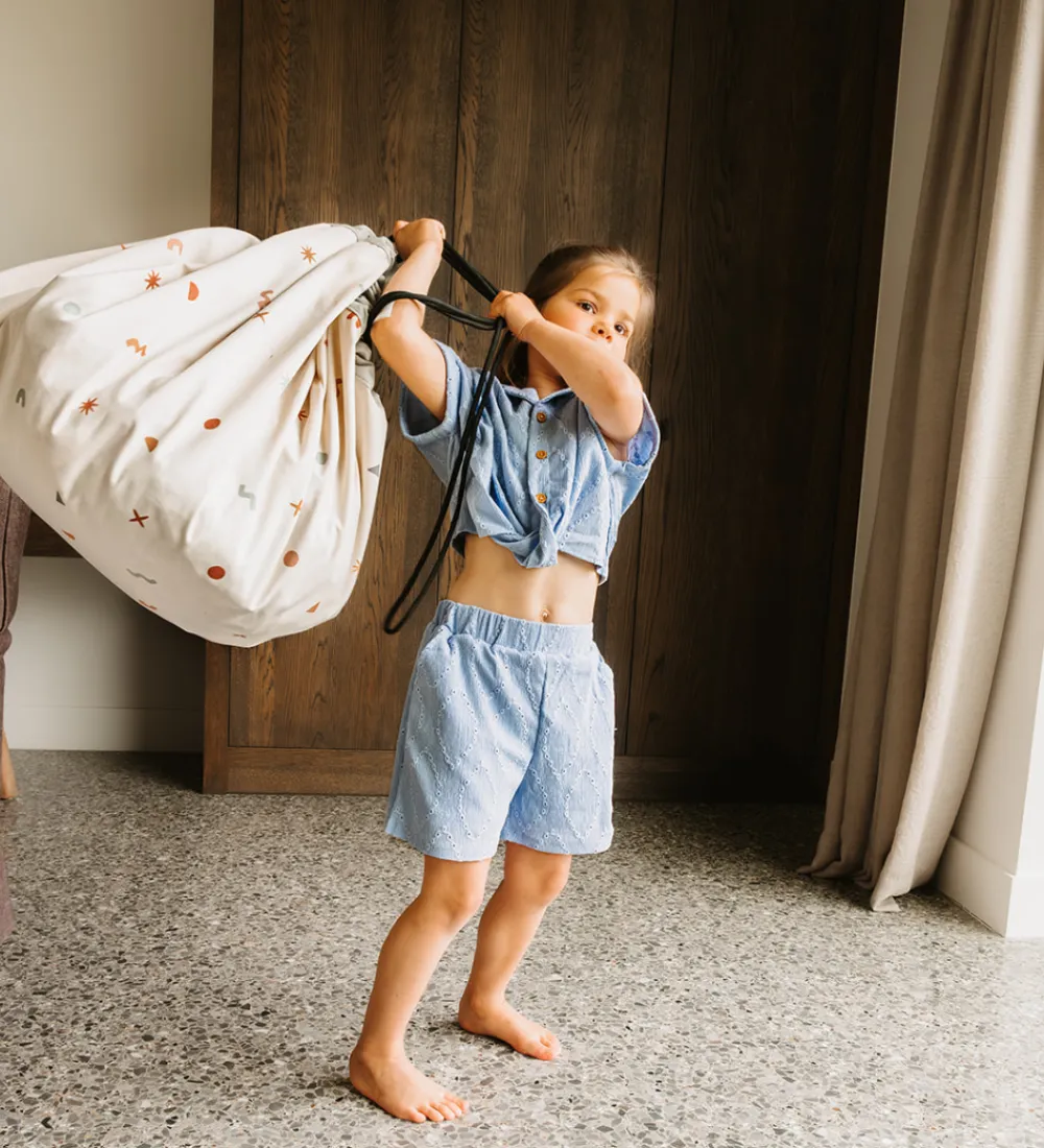 Charmerende Play&Go legetæppe og opbevaringspose med to-i-en funktion. Legetæppet er råhvidt med støvet grøn kant og dobbetsidet print med små motiver på den ene side og by-print på den anden side. Legetæppet har en rund facon med snore i siderne, som kan trækkes sammen, så legetæppet bliver til en opbevaringspose.