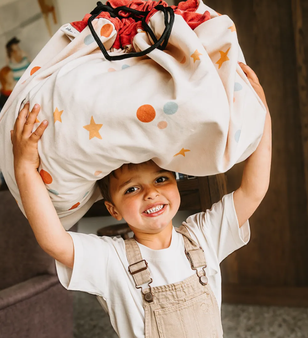 Charmerende Play&Go legetæppe og opbevaringspose med to-i-en funktion. Legetæppet er råhvidt med rød kant og dobbetsidet print med stjerner og cirkler på den ene side og cirkus-print på den anden side. Legetæppet har en rund facon med snore i siderne, som kan trækkes sammen, så legetæppet bliver til en opbevaringspose.