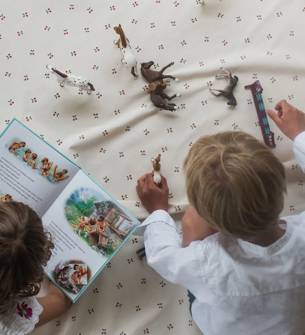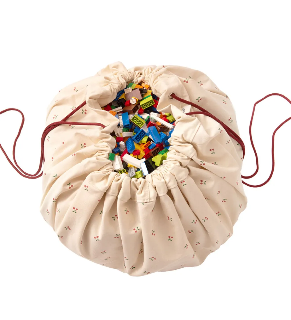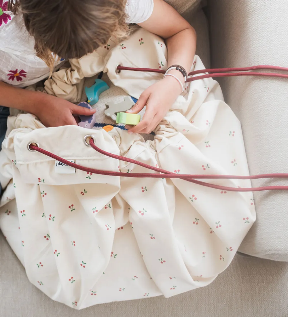 Flot Play&Go legetøjstæppe i hvid med røde kanter og med et alloverprint af små kirsebær.