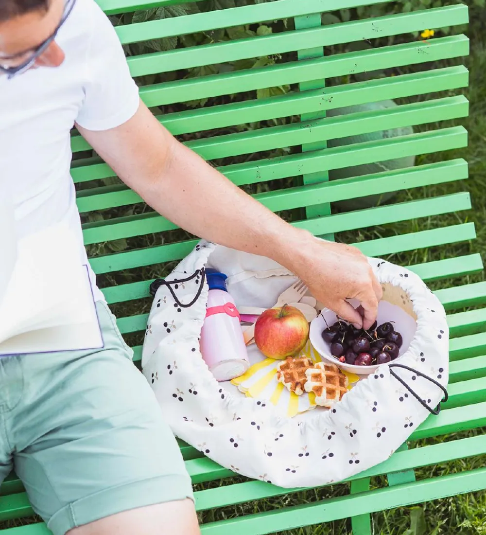 Praktisk Play&Go legetøjstæppe til udendørs aktiviteter i crmehvide med mønster af kirsebær i guld og sort.