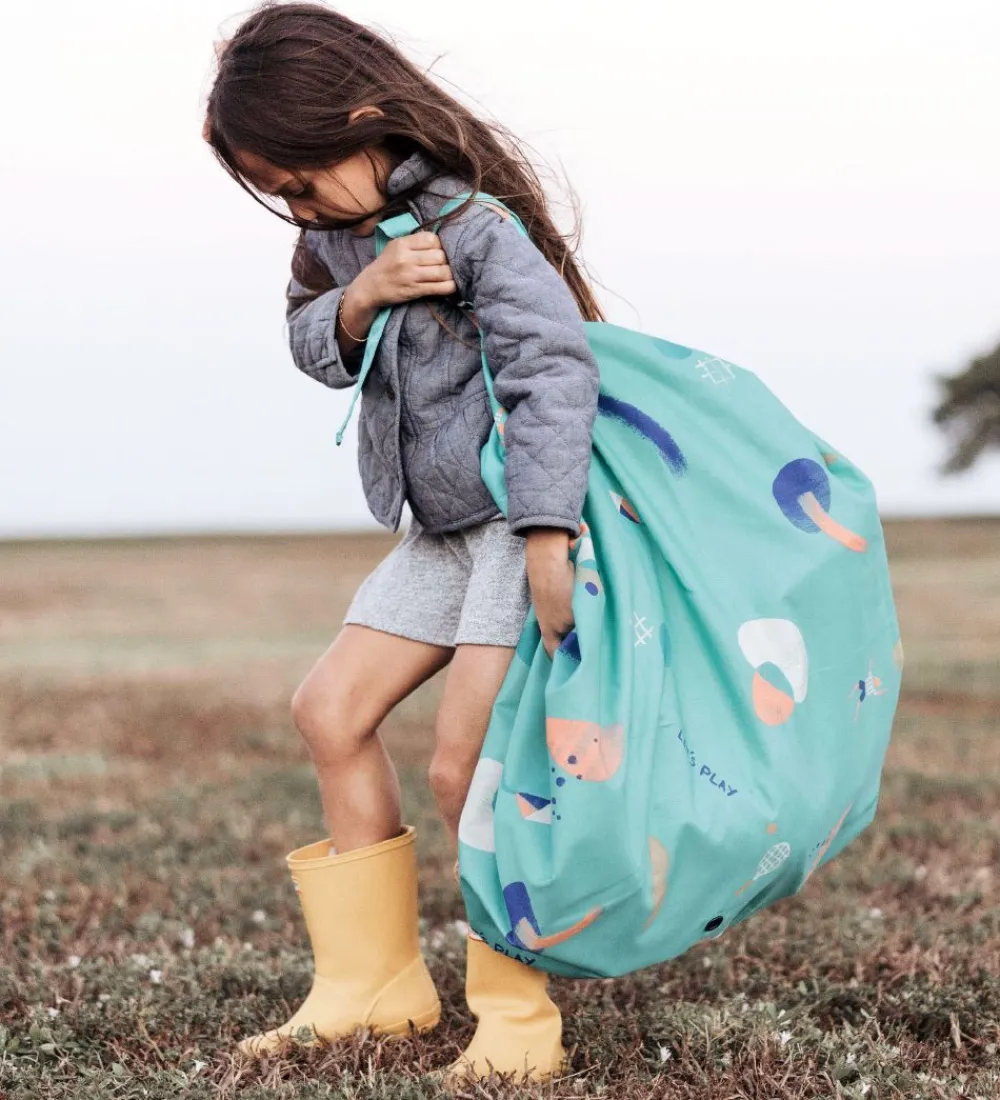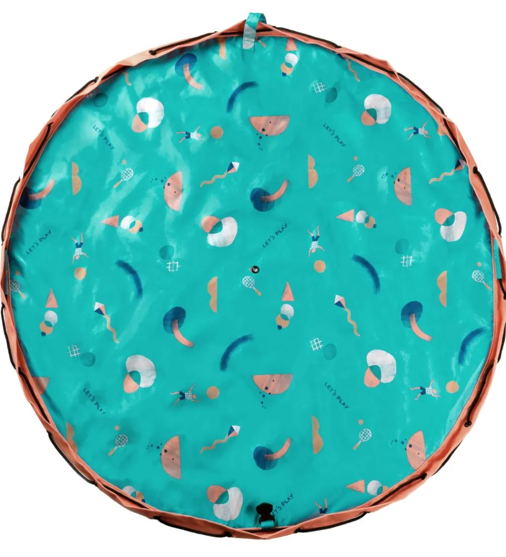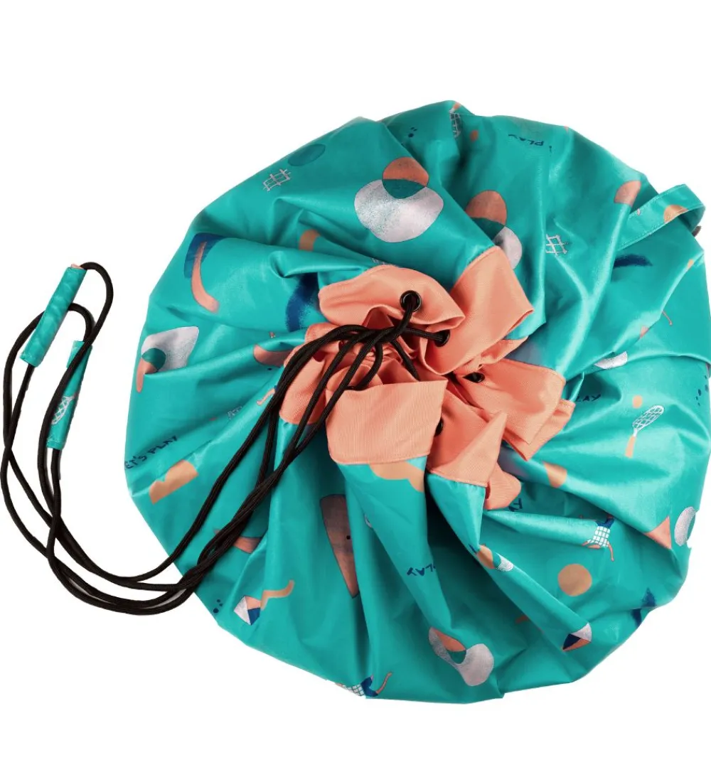 Smart Play&Go legetøjstæppe i en blågrøn nuance med et blåt, hvidt og blommefarvet print på den ene side, og på den anden side er den ensfarvet blågrøn.