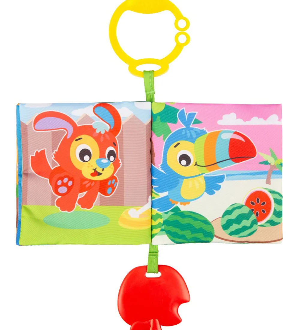 Fin Playgro stofbog med illustrationer i et væld af farver, som fanger opmærksomheden. Playgro stofbogen har et rødt æble, som barnet kan bide i. I den ene side er der en gul ring, som stofbogen kan hænges op i.