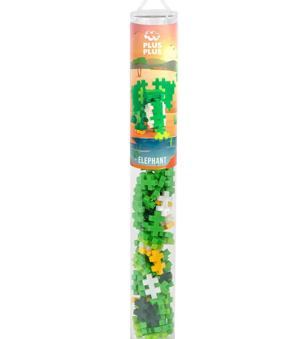 Sjove Plus-Plus klodser i et sæt med et elefant-tema, som indeholder 100 klodser samt en byggeinstruktion til inspiration.