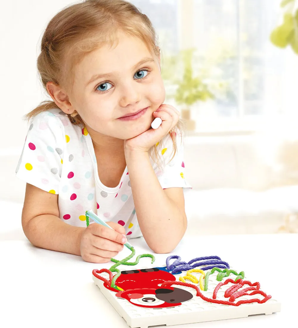 Sjovt Quercetti kreasæt, hvor børn kan færdiggøre søde motiver med tråde i skønne farver. I æsken medfølger:
