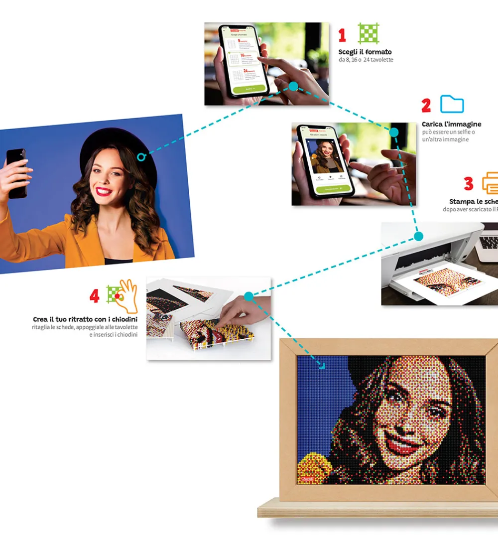 Sjov Quercetti pixel art med i alt 9600 dele, som man kan lave sit eget billet til en mosaik. I æsken medfølger: