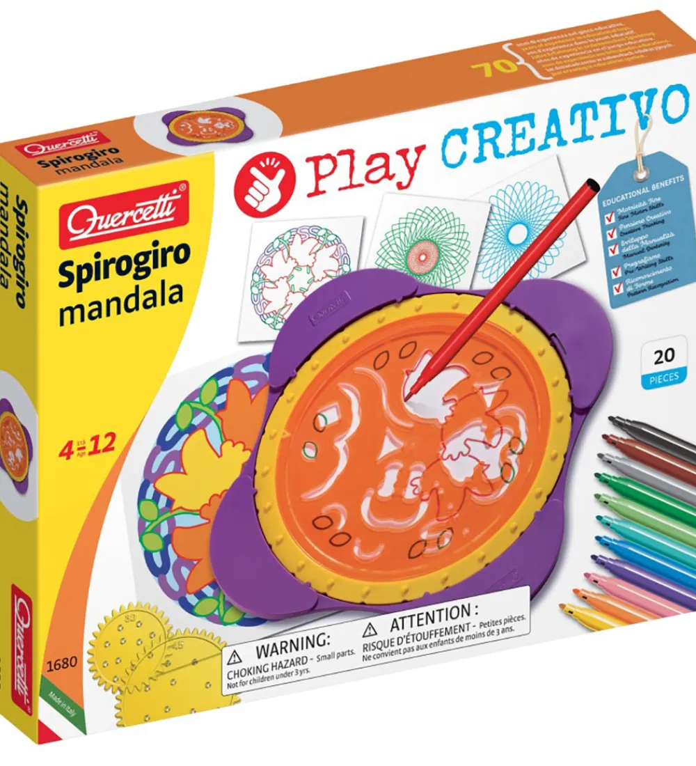 Sjovt Quercetti tegnesæt, hvor børn kan lave Mandala-motiver med skabeloner og tandhjul. I æsken medfølger: