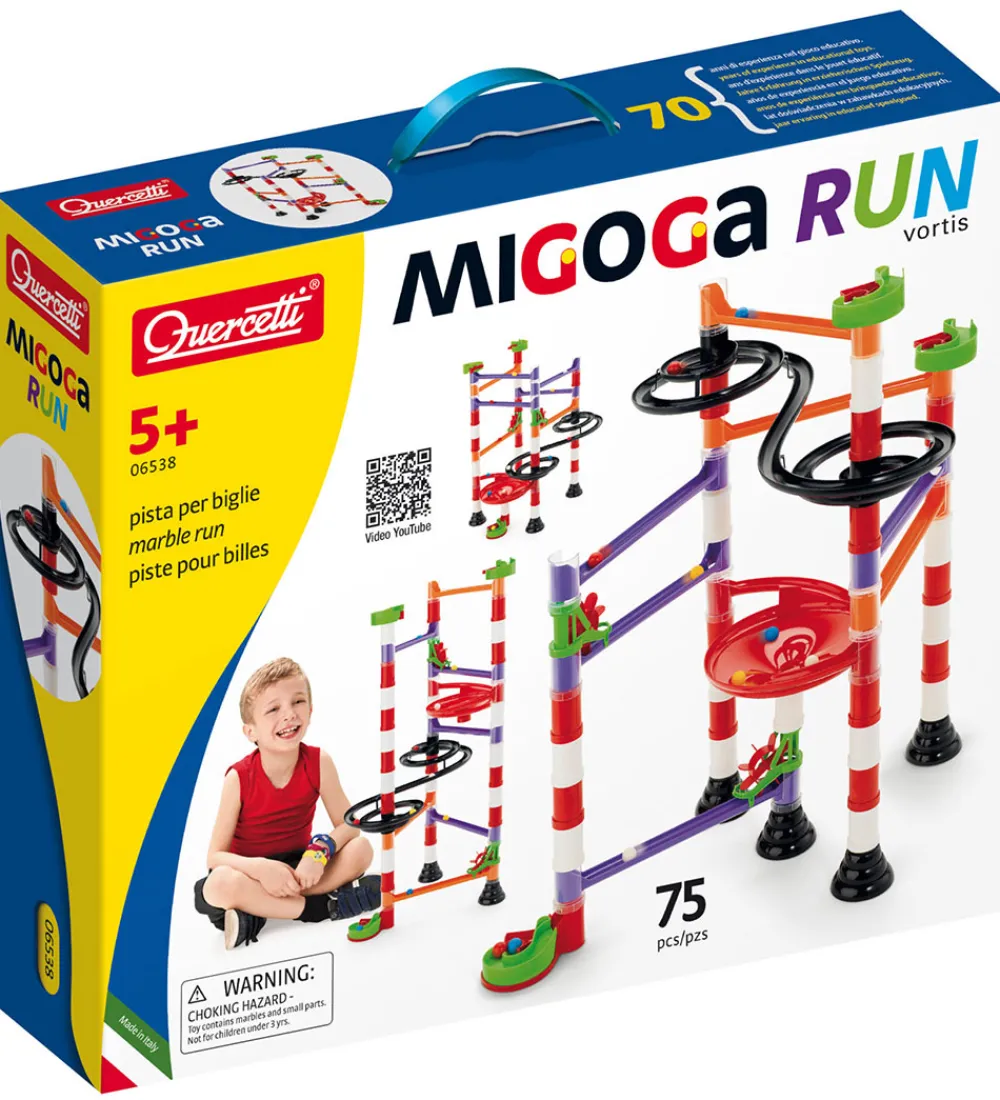 Kuglebanen er perfekt til byggeglade børn og stimulerer de visuel-rumlige evner, årsag/virkning-princippet og problemløsning. Quercetti udvikler legetøj ud fra STEAM-læring, som indebærer videnskab, teknologi, ingeniørarbejde, kunst og matematik.
