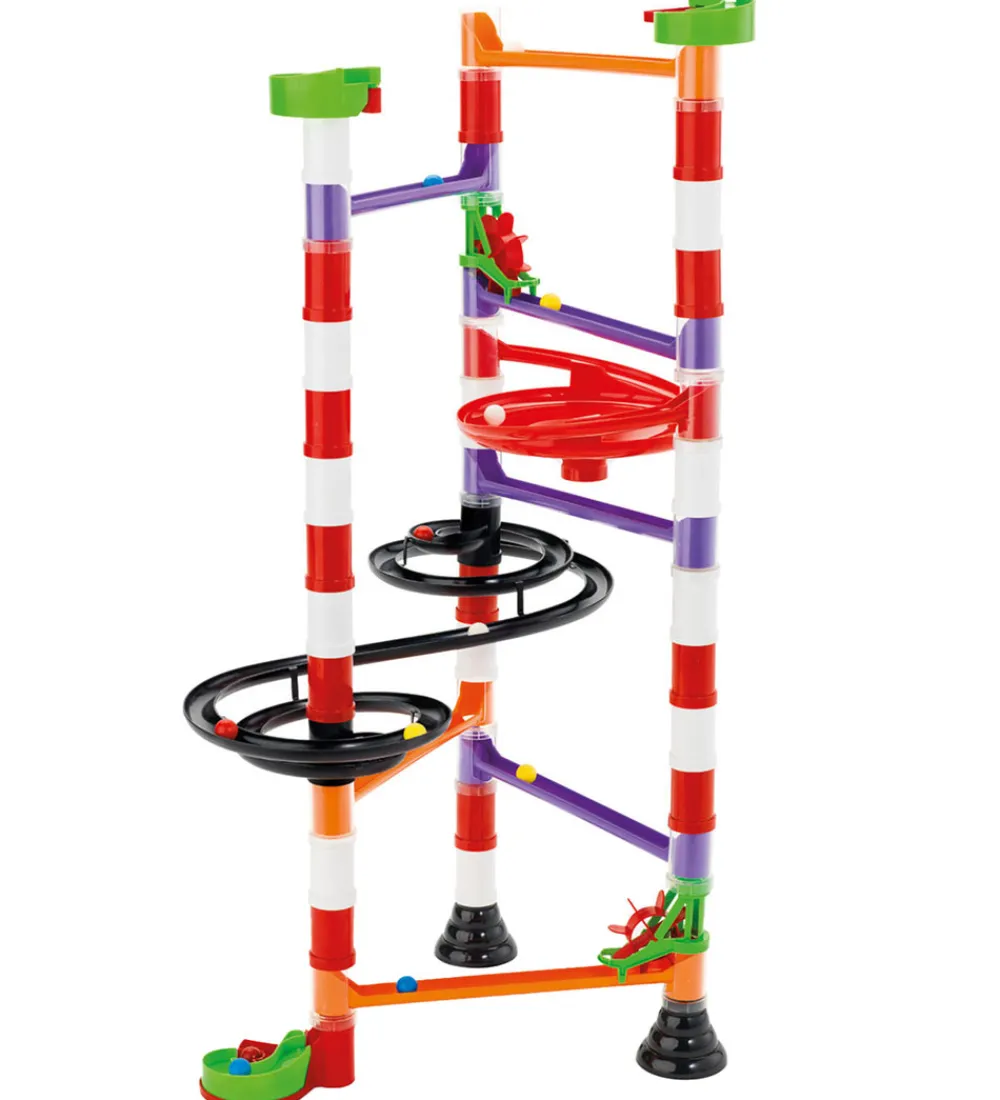 Fin Quercetti kuglebane i flotte farver, der kan samles på flere måder. I æsken medfølger: