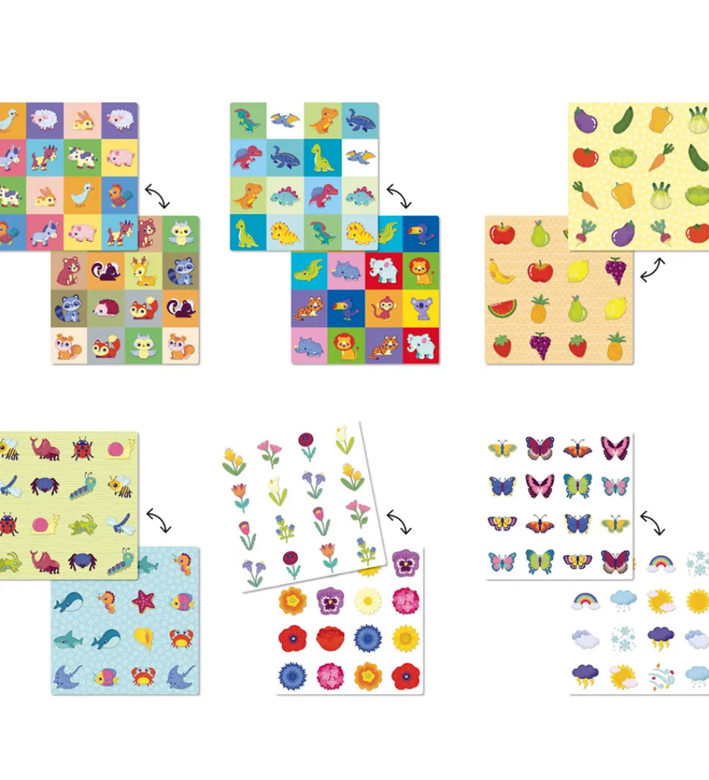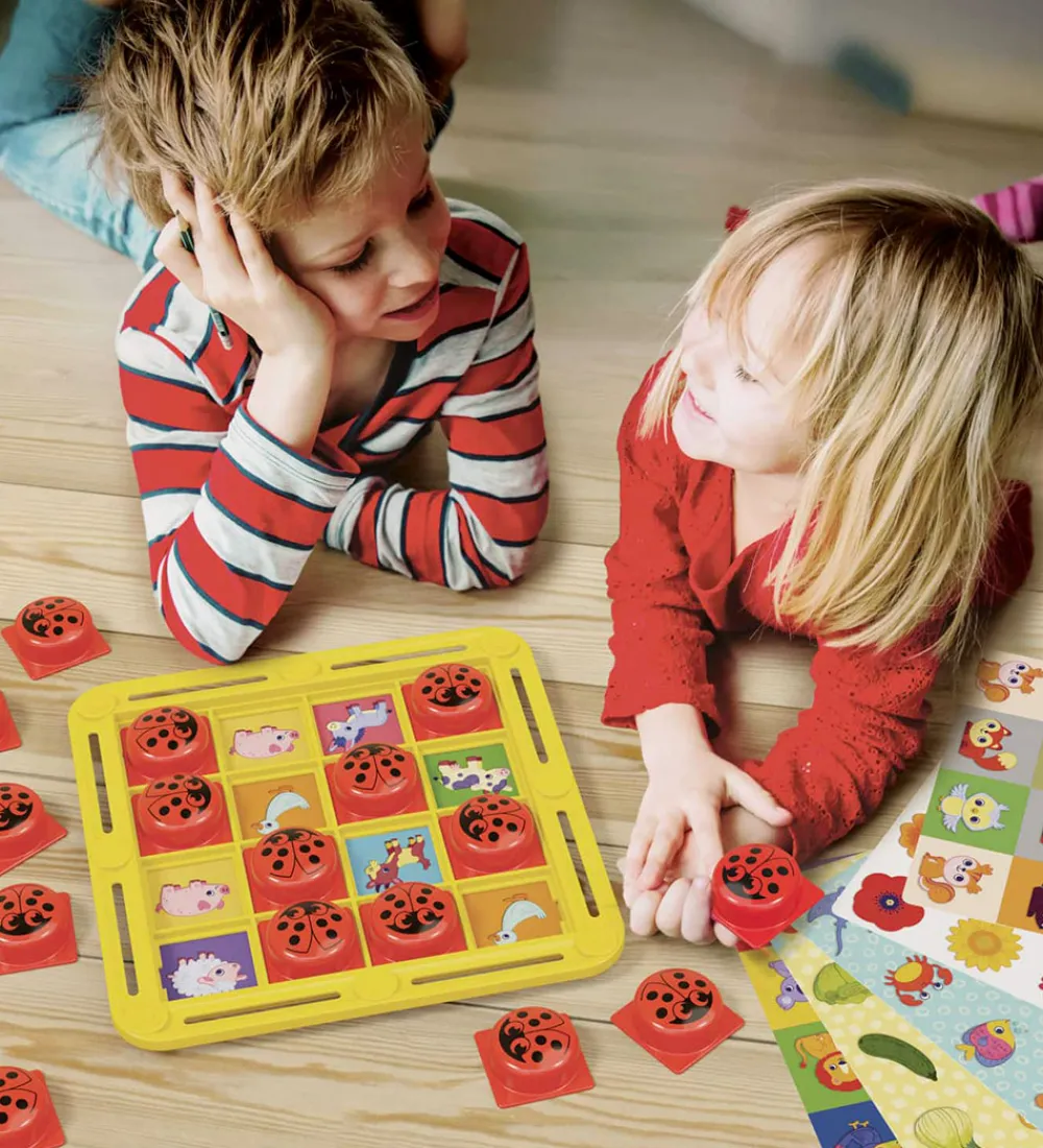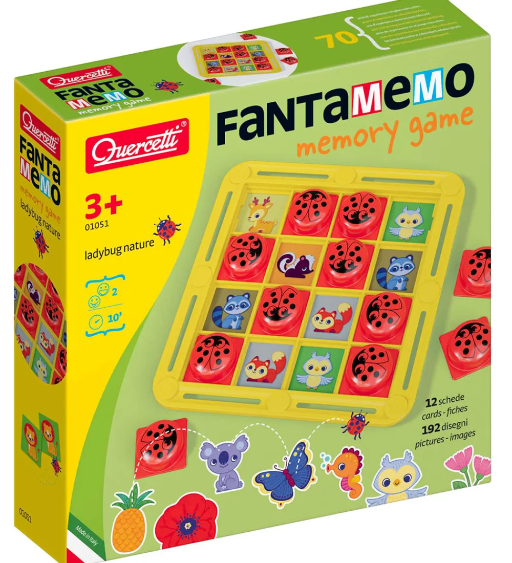 Sjovt Quercetti vendespil, der i denne udgave spilles på en plade med udskiftelige vendespil, der hver har 16 felter á 8 par. Oven på hvert felt lægges en mariehøne, som følger med i pakken, og det er dem, skjuler de forskellige motiver i hvert spil. I æsken medfølger: