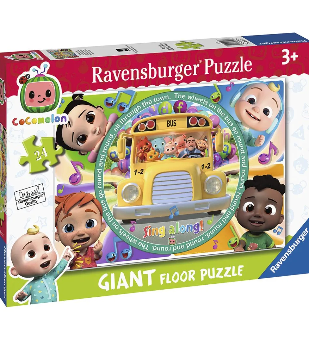Fint Ravensburger puslespil af figurer fra CoComelon. Puslespillet opfordrer til at man skal synge “hjulene på bussen” på engelsk og teksten står hele vejen rundt i en cirkel.
